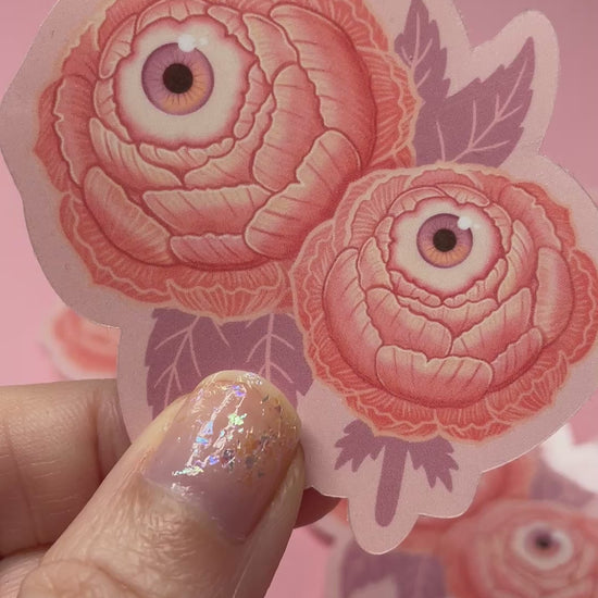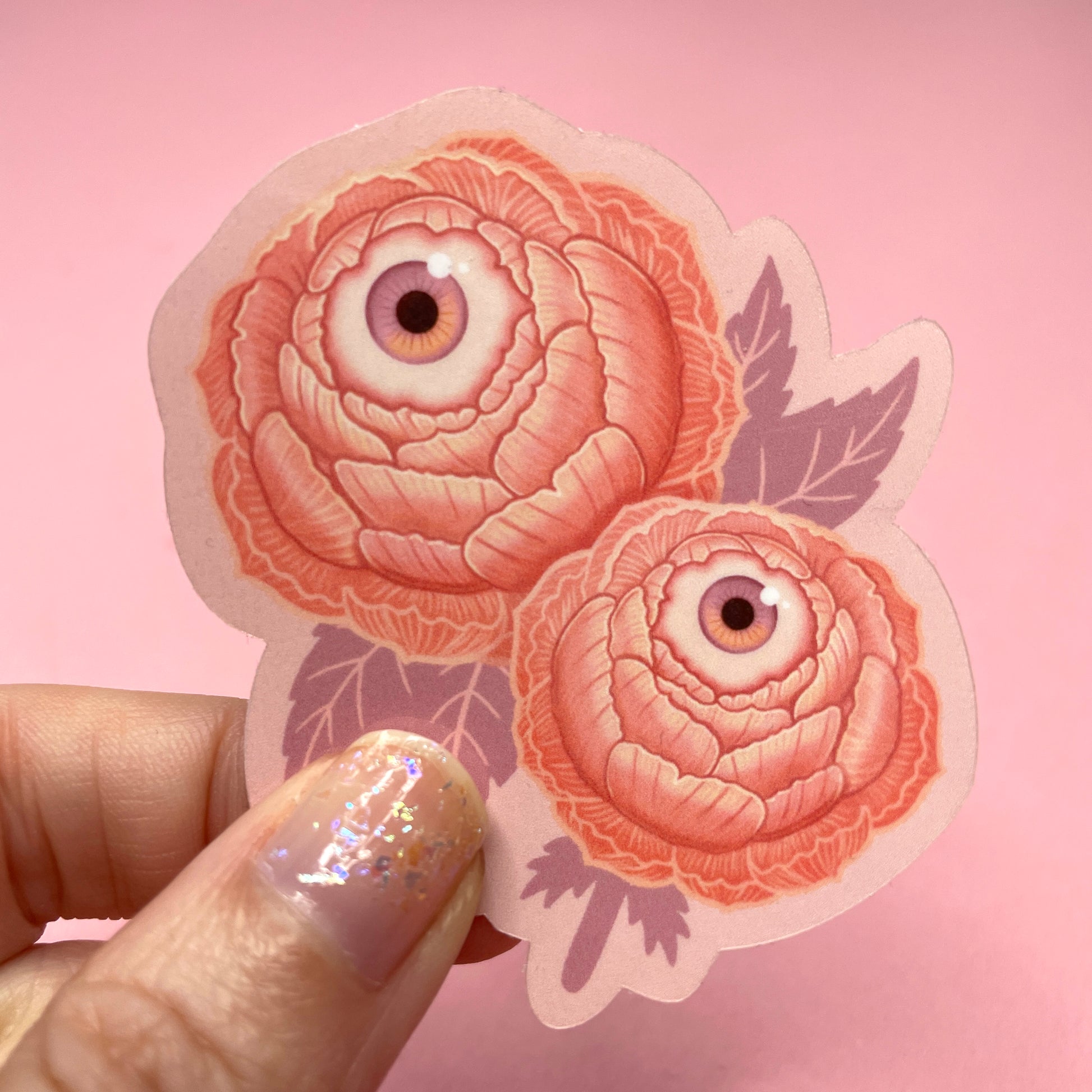 A spooky die cut waterproof vinyl sticker of my original illustration of a pair of pink Peony flowers with Eyeball centres.