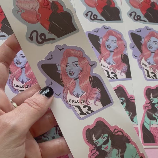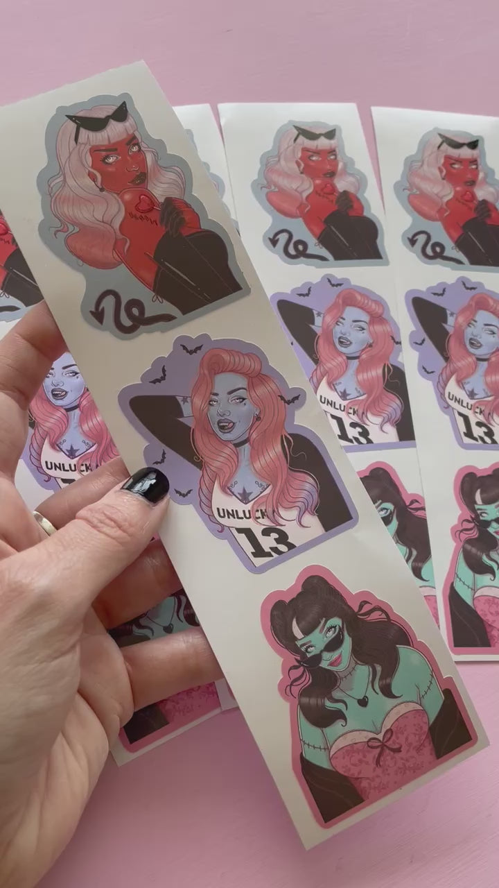 A spooky die cut waterproof vinyl sticker of my original illustration "Unholy: Demon Girl". This gothic sticker is great if you love occult stickers, witchy, pinup or monster girl stickers.