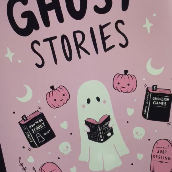 A signed, giclee inkjet fine art print of my original illustration: "Ghost Stories", available in 4 different colours. This print has a cute ghost reading, surrounded by books and gravestones. Ideal for book lovers.