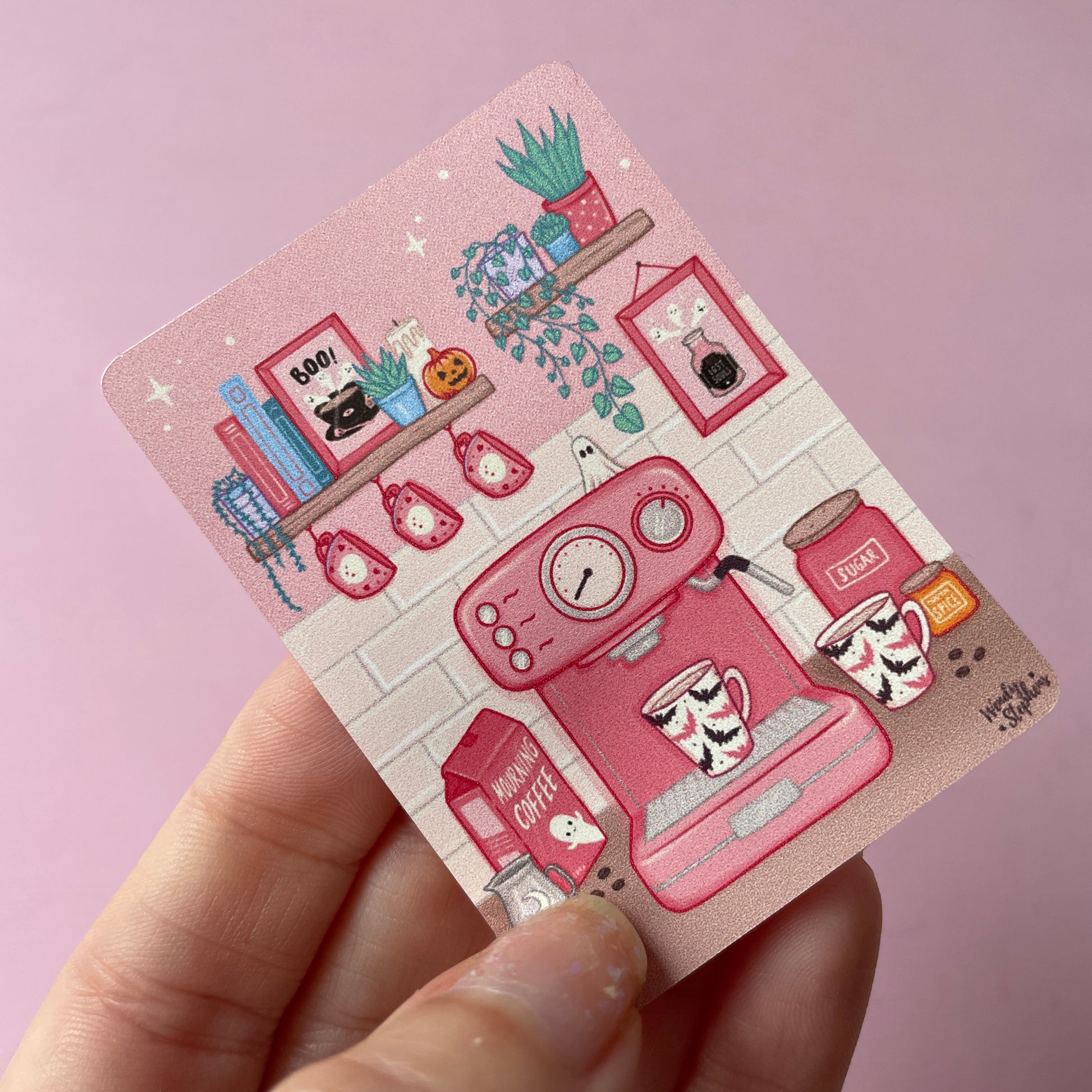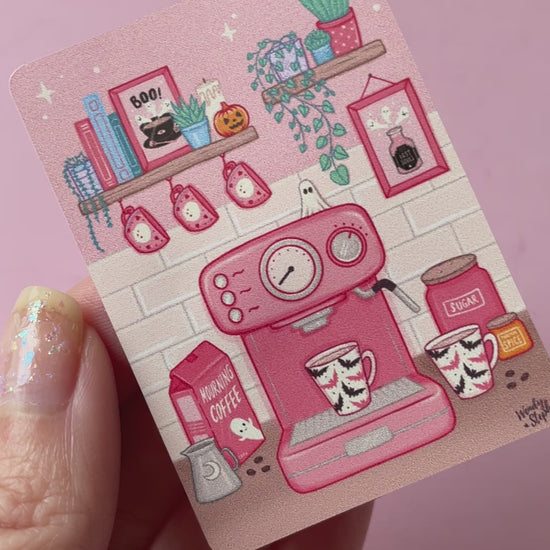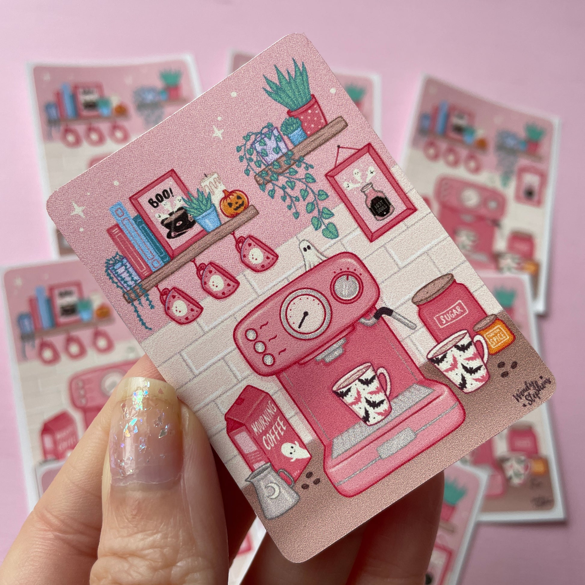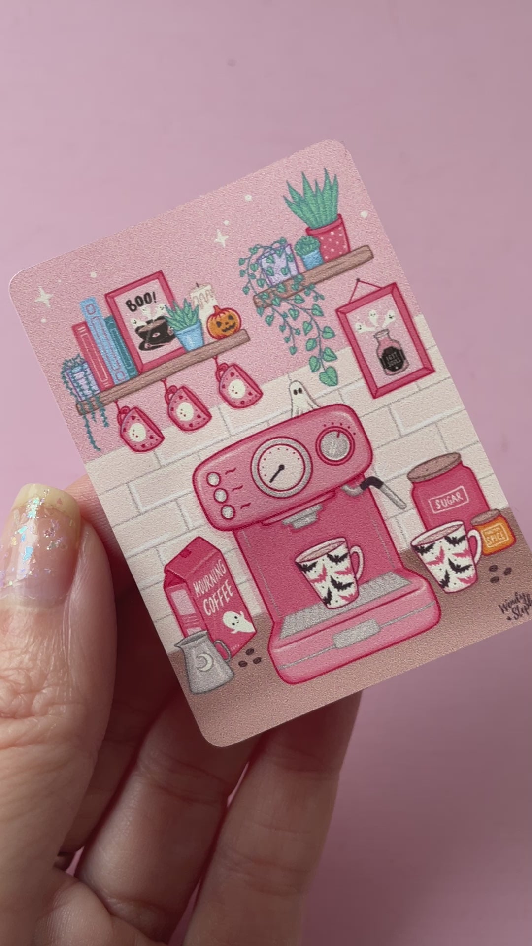 A spooky die cut waterproof vinyl sticker of my original illustration: "Spooky Coffee Machine". It features Mourning Coffee, bat mugs, cute plants and a bookshelf. Perfect for coffee shops, coffee stations or gothic kitchens.