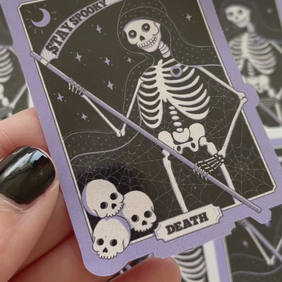 A spooky die cut waterproof vinyl sticker of my original illustration "Death Tarot Card". This gothic sticker is great if you love occult stickers or witchy stickers. This grim reaper carries a scythe that reminds you to ‘Stay Spooky'.