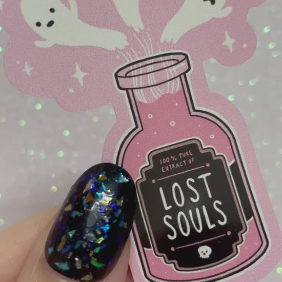 A spooky die cut waterproof vinyl sticker of my original illustration: "Lost Souls". This sticker has a potion bottle of lost souls with cute ghosts pouring out.