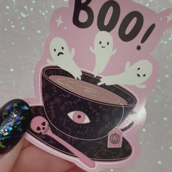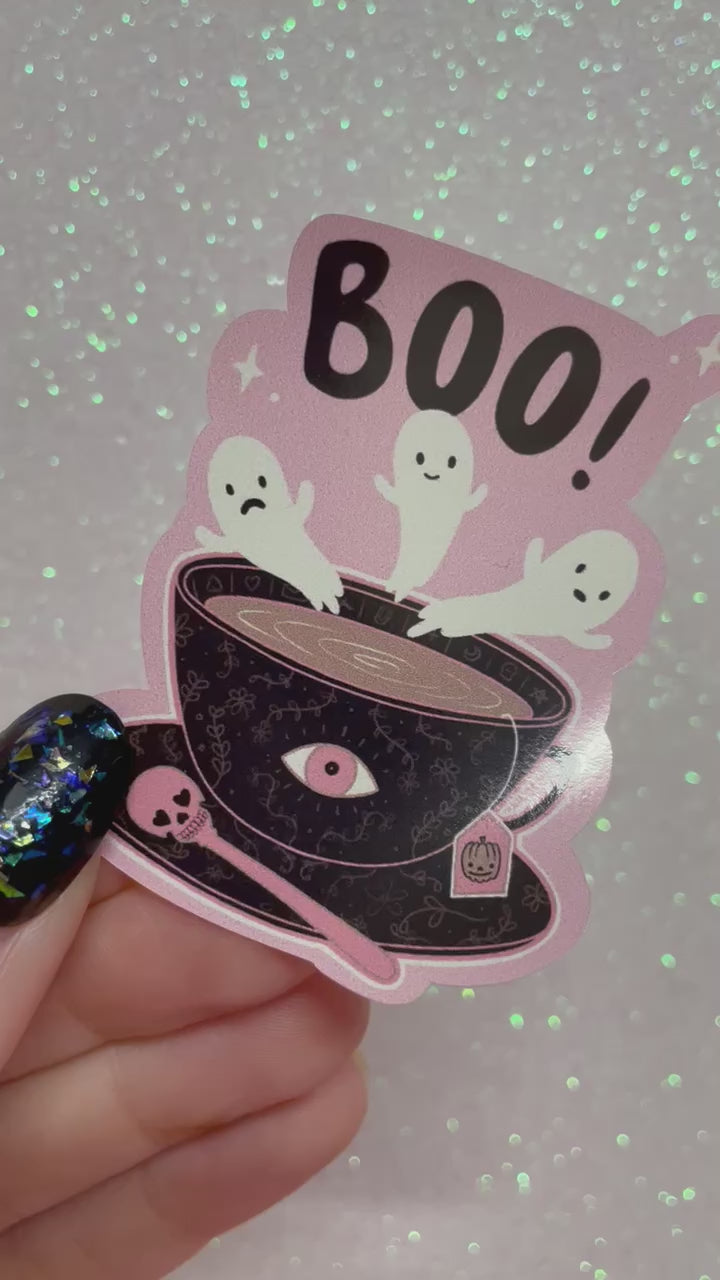 A spooky die cut waterproof vinyl sticker of my original illustration: "Boo! Teacup". This cute little teacup has a skull spoon, pumpkin tea and spooky ghosts.