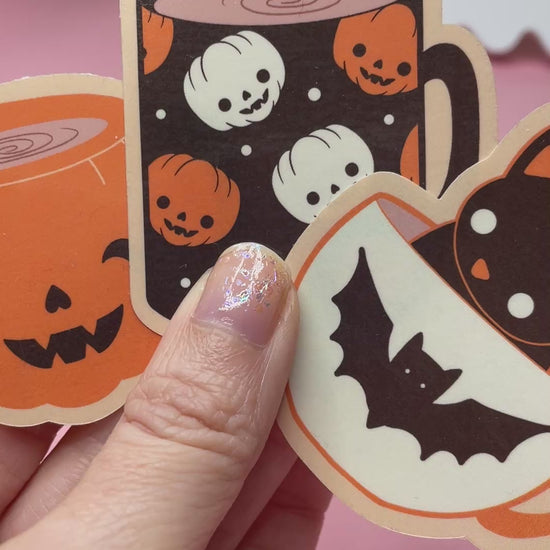 Spooky Coffee Mugs Stickers: Pumpkin Mugs, Cute Cat in Teacup Vinyl Sticker
