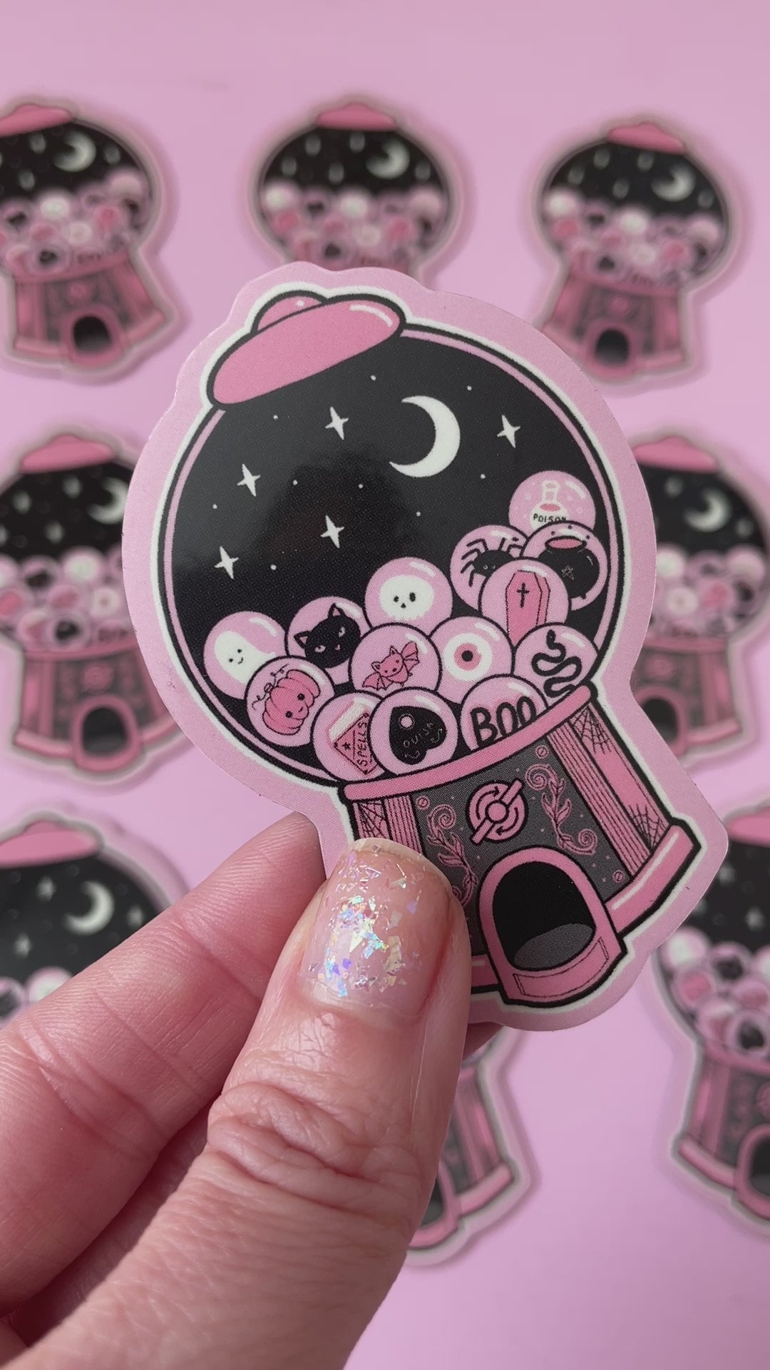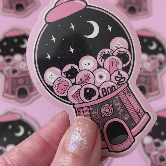 A cute, waterproof gothic fridge magnet of a Spooky Gumball prize machine. Featuring skulls, pumpkins, cauldrons, ghosts, bats, spiders, all in a vintage coin operated style machine.