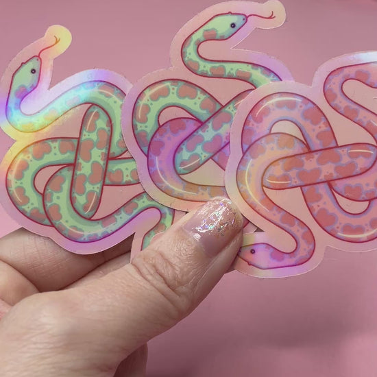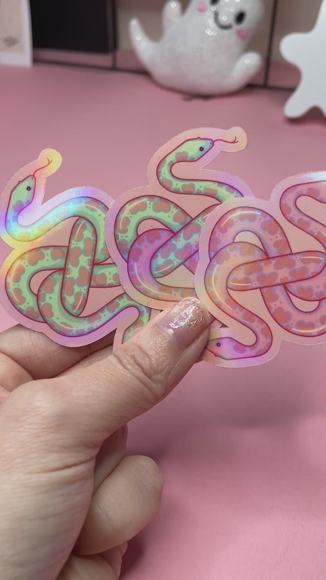 A spooky die cut waterproof vinyl sticker of a Two Headed Snake. This snake looks like two snakes at first, but when you look closer, you realise this is one snake - but with a bite at both ends. Double Trouble! There is a choice of 3 colours, pink, green or multicolour.