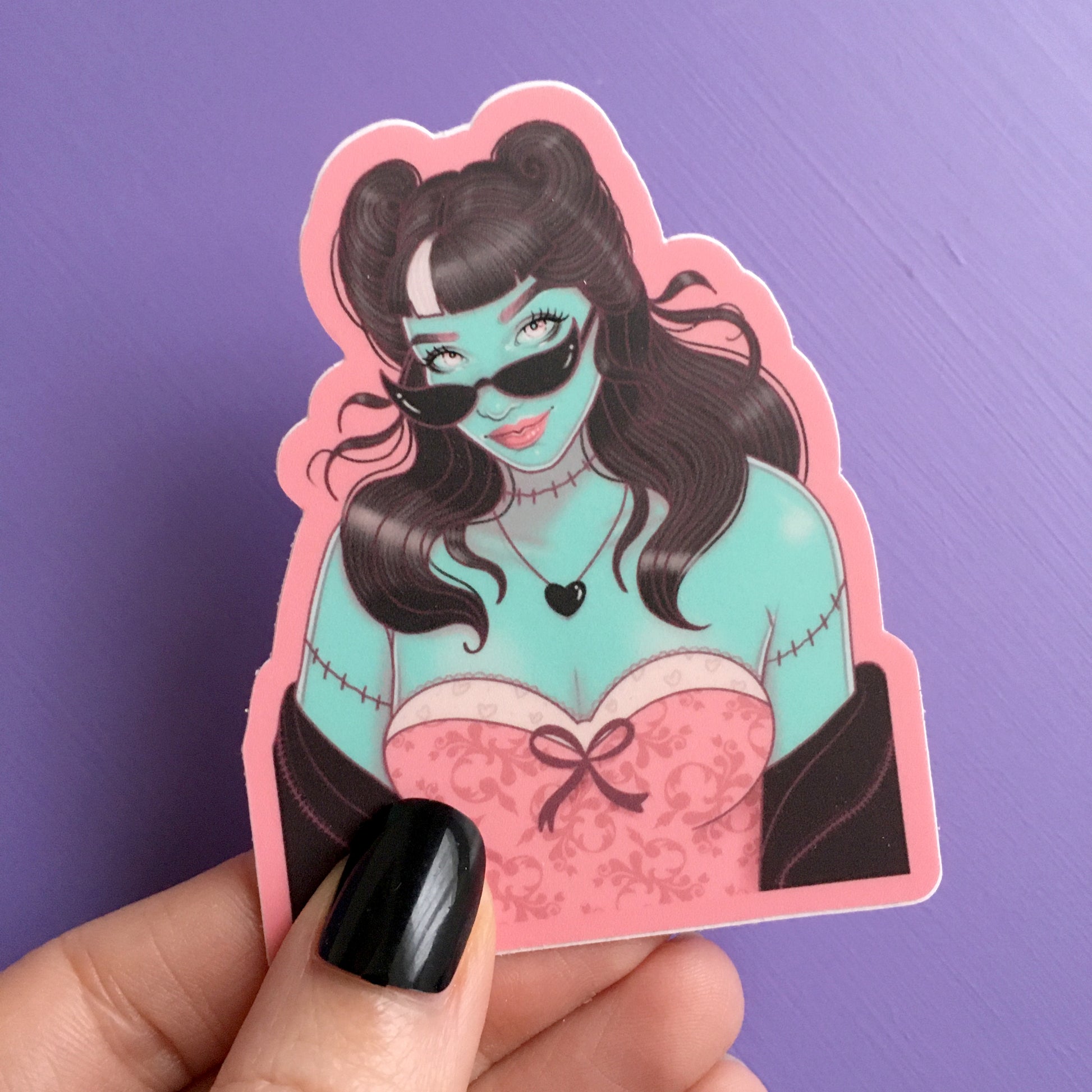 A spooky die cut waterproof vinyl sticker of my original illustration "Unholy: Zombie Girl". This gothic sticker is great if you love occult stickers, witchy, pinup or monster girl stickers.