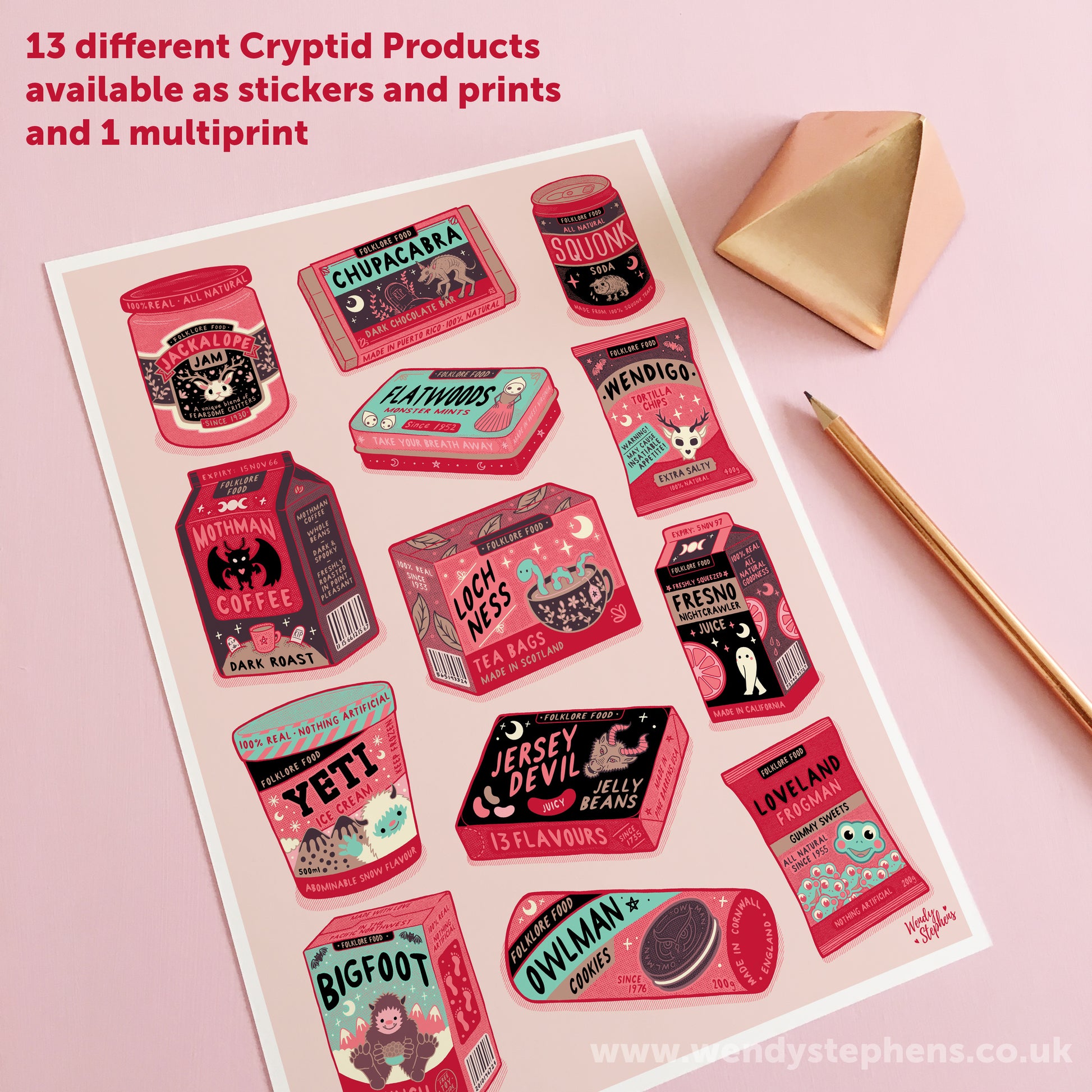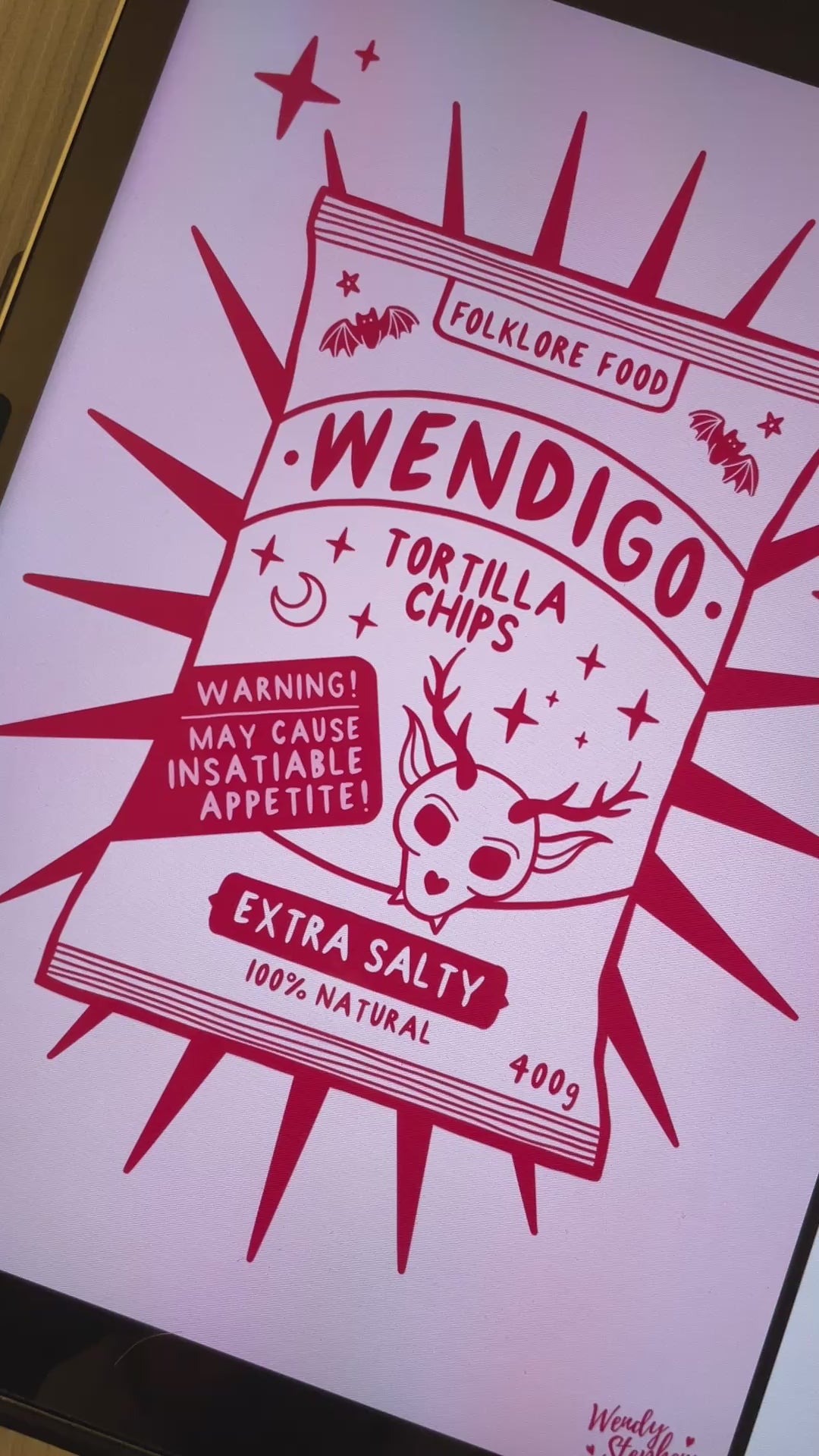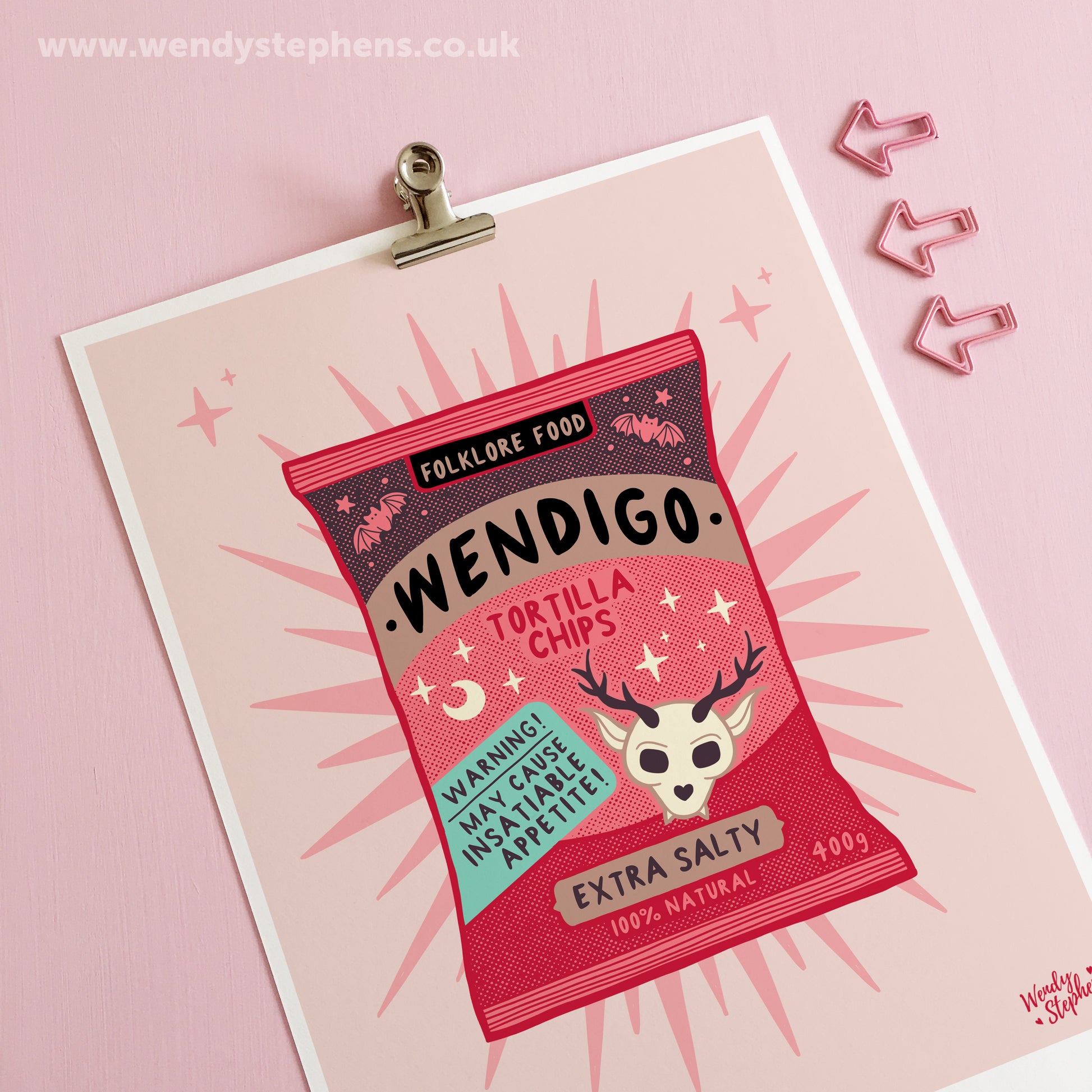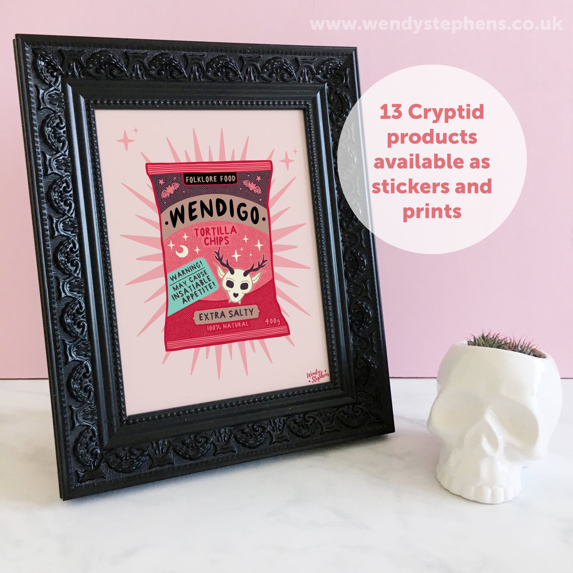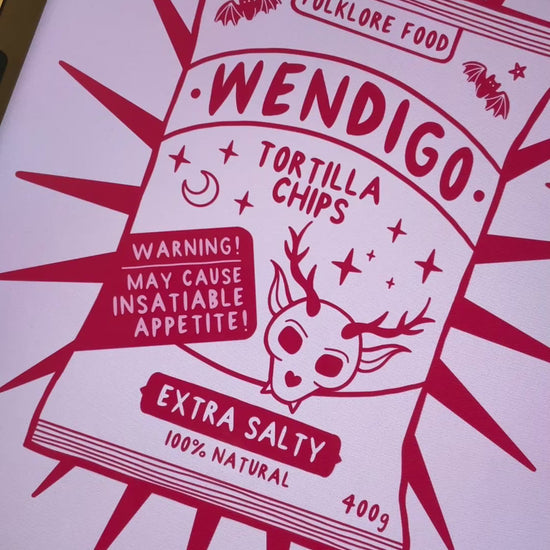 A signed, giclee inkjet fine art print of my original illustration of 'Wendigo Chips'. There are 13 different Cryptids artprints in this Folklore Foods series. Ideal for gothic kitchen wall art or spooky homeware ideas.